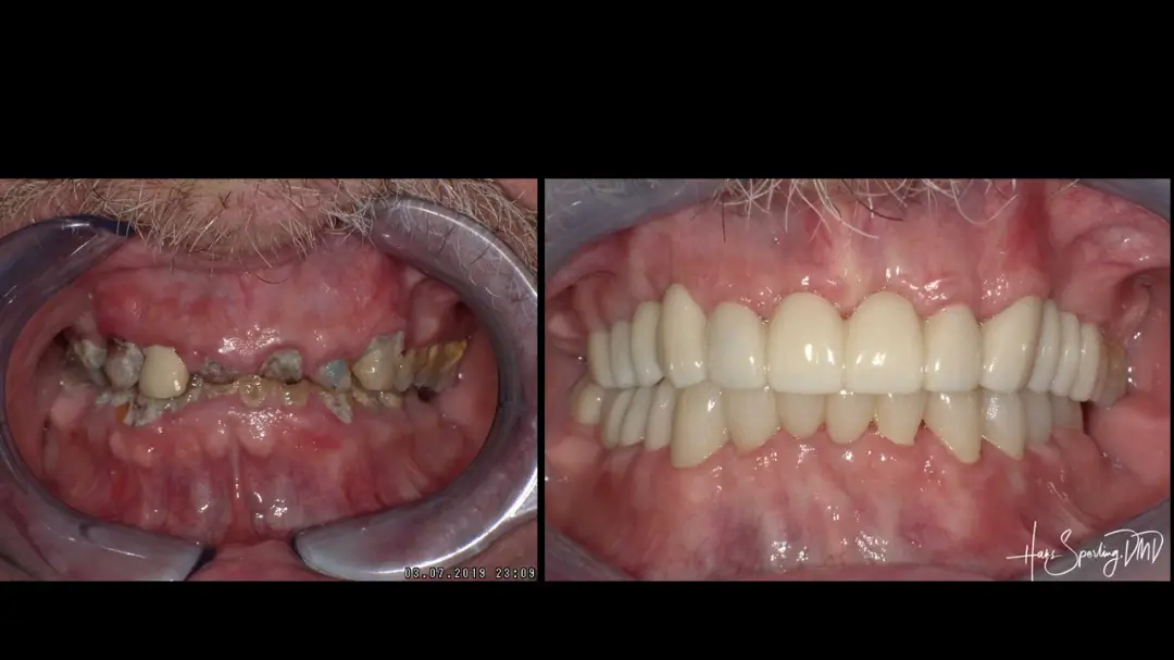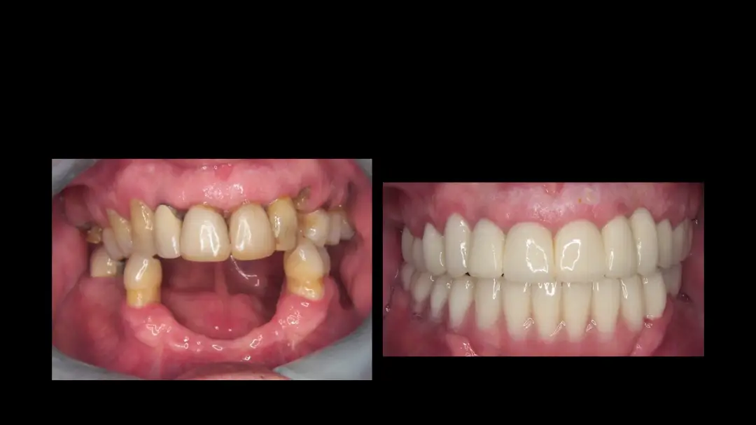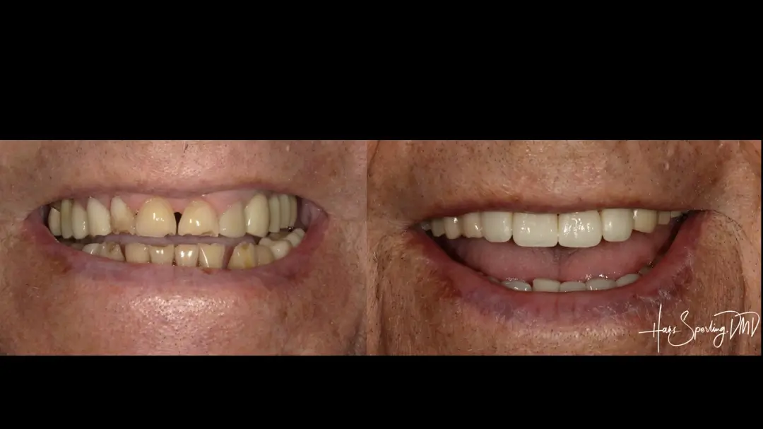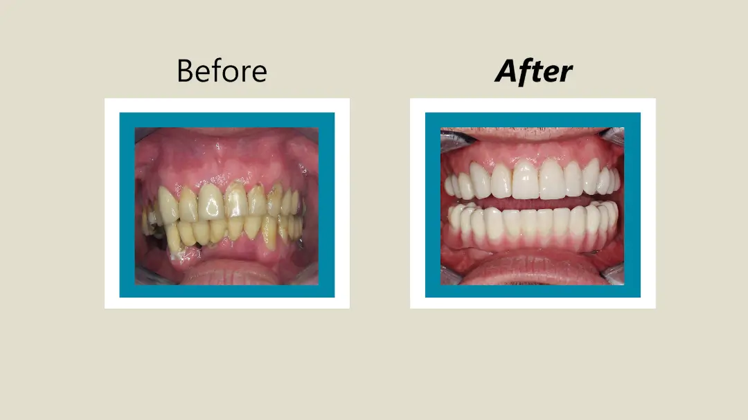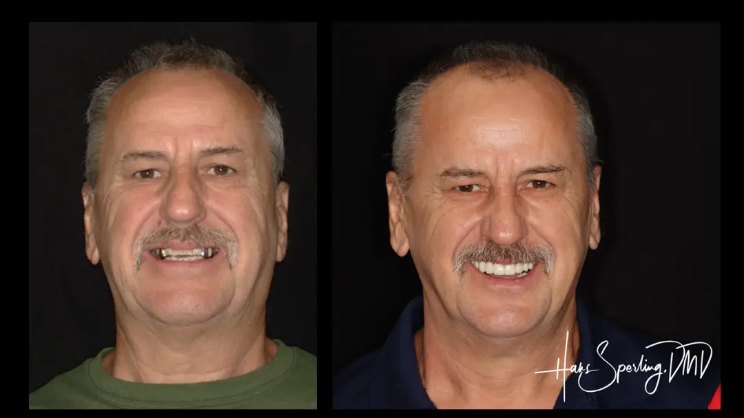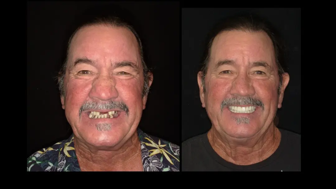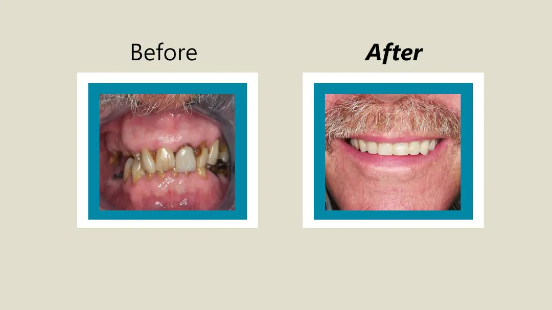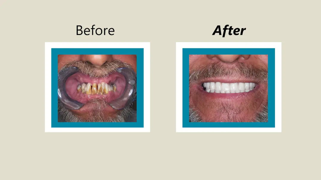 After: Great smile, chewing function, and facial tissue support possible with an Upper Denture that is supported with Implants and Lower Implants and Crowns.