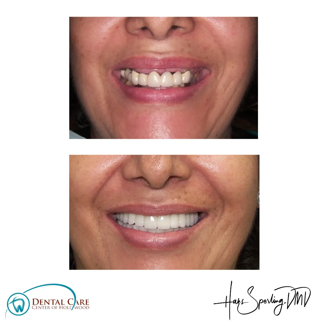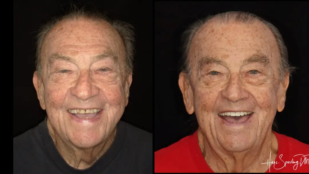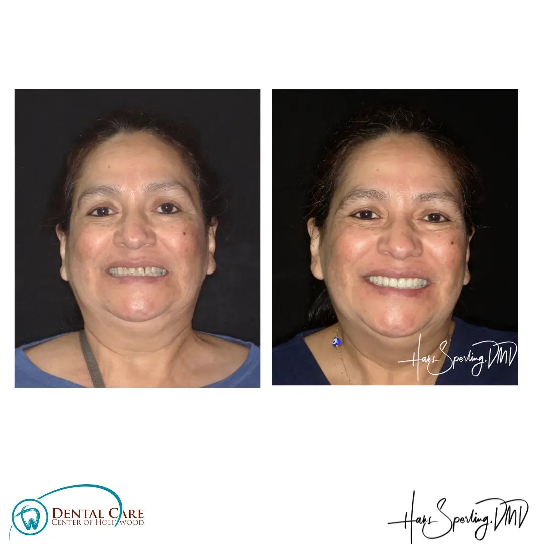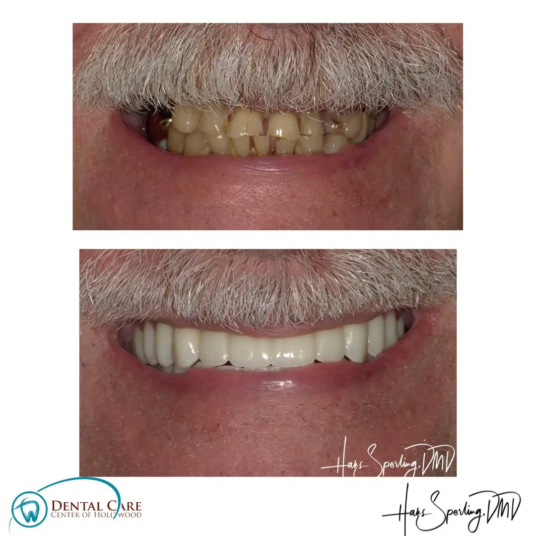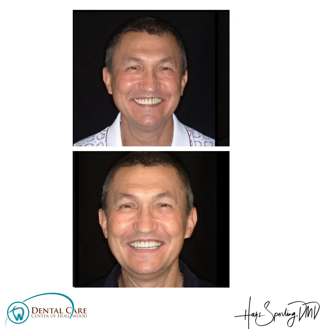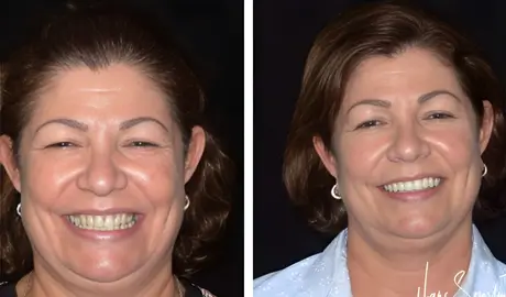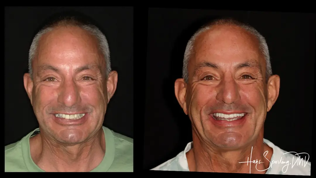 After: Great smile, chewing function, and facial tissue support possible with an Upper Denture that is supported with Implants and Lower Implants and Crowns.