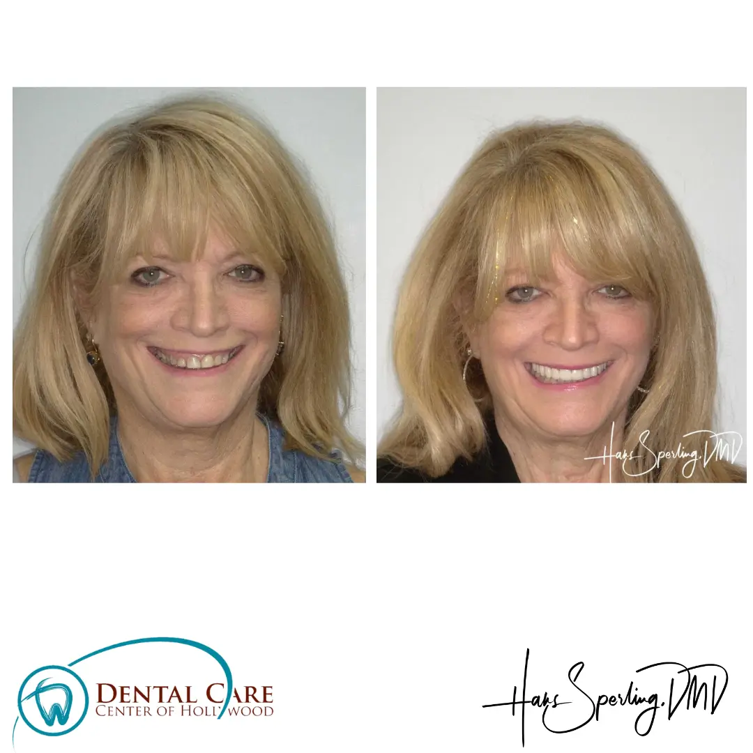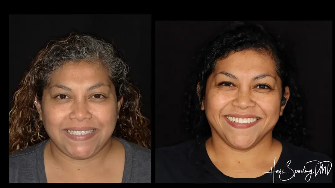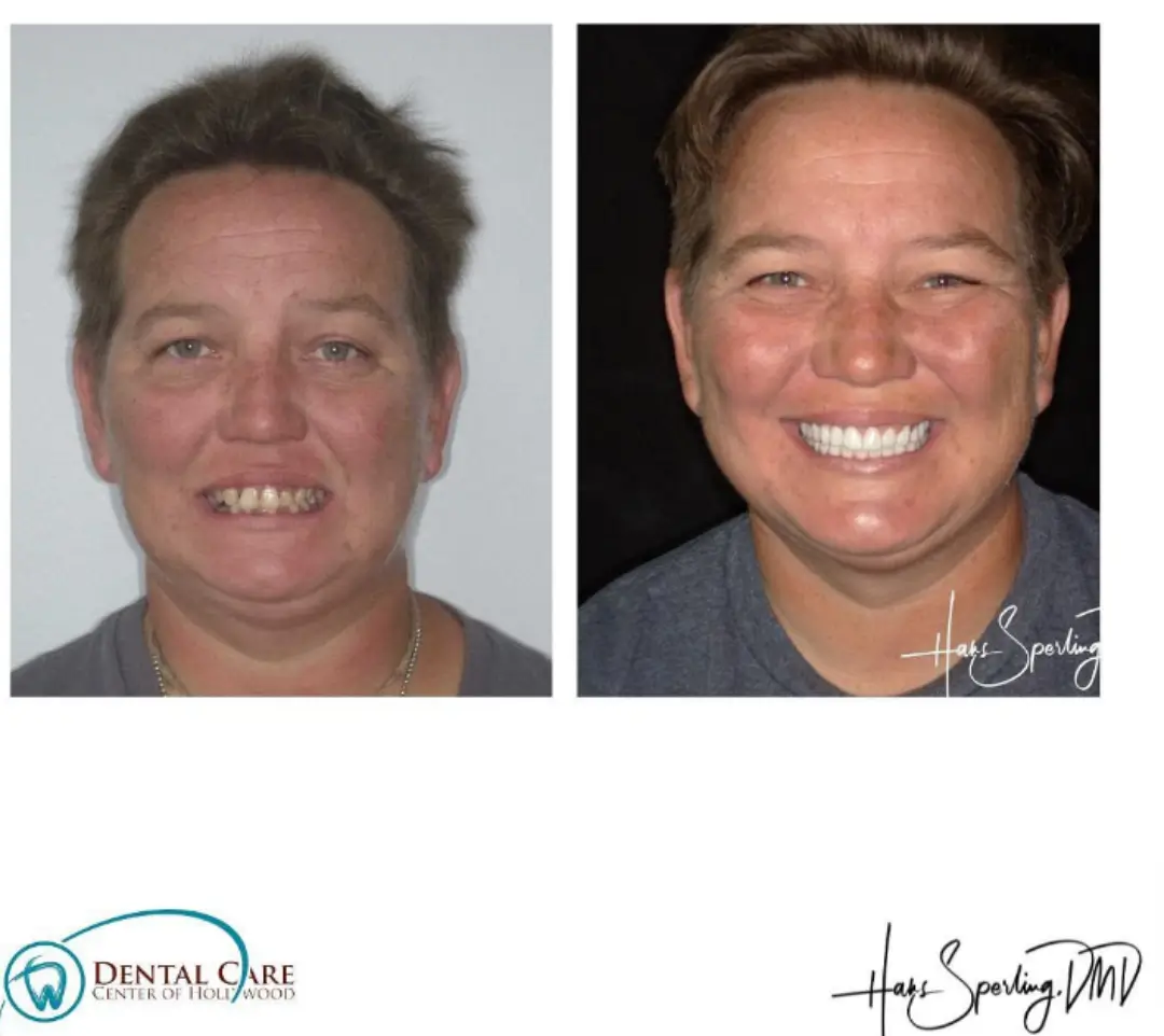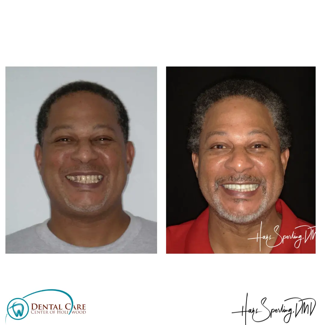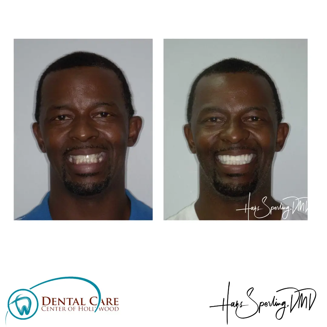 After: Great smile, chewing function, and facial tissue support possible with an Upper Denture that is supported with Implants and Lower Implants and Crowns.