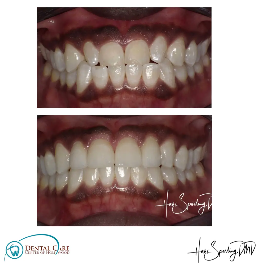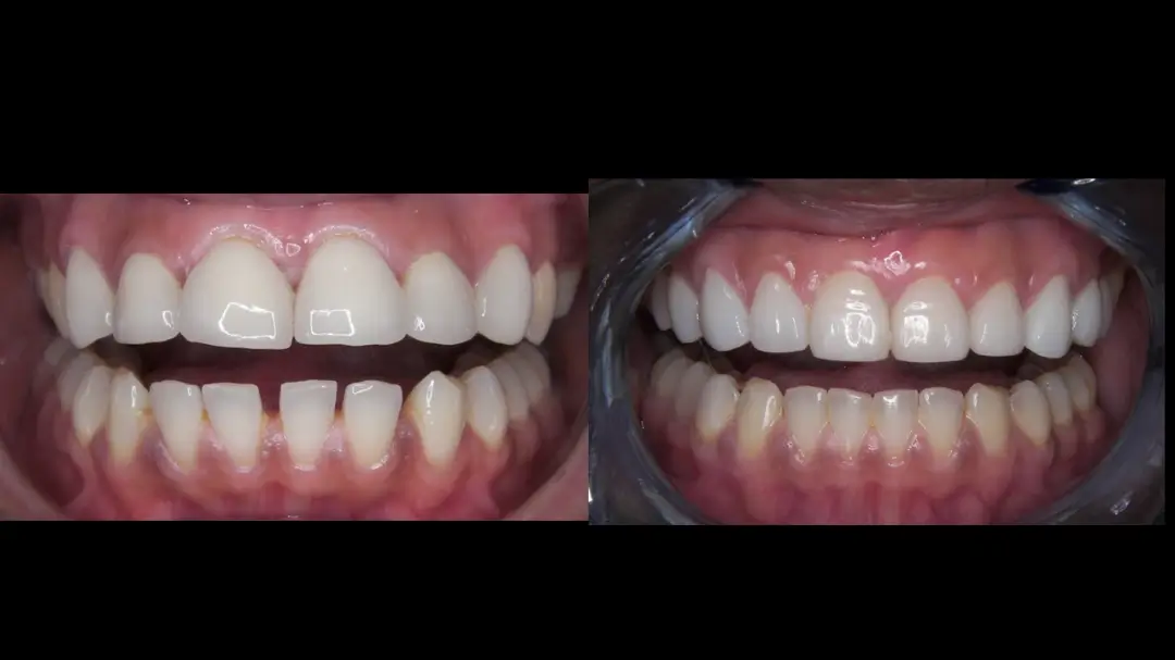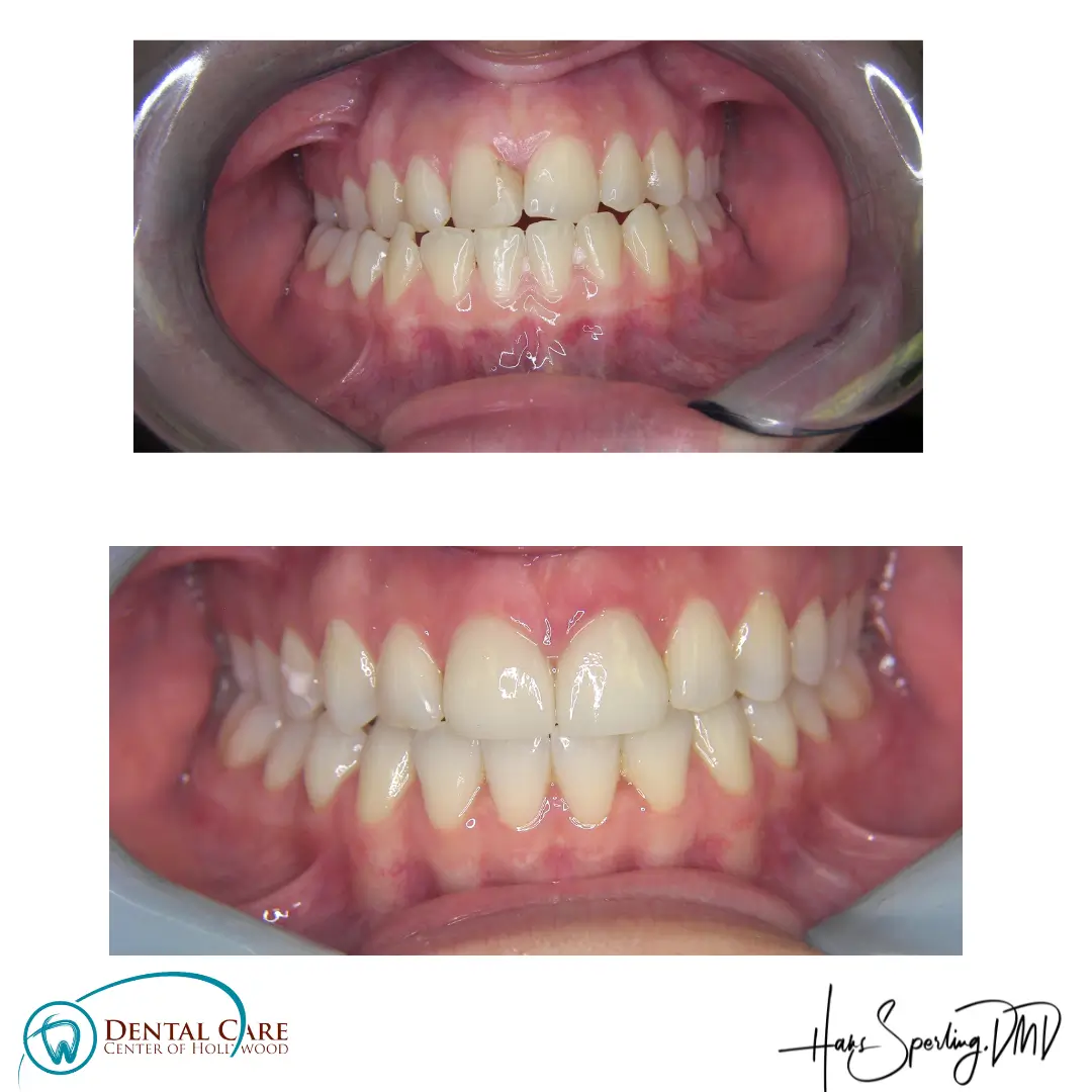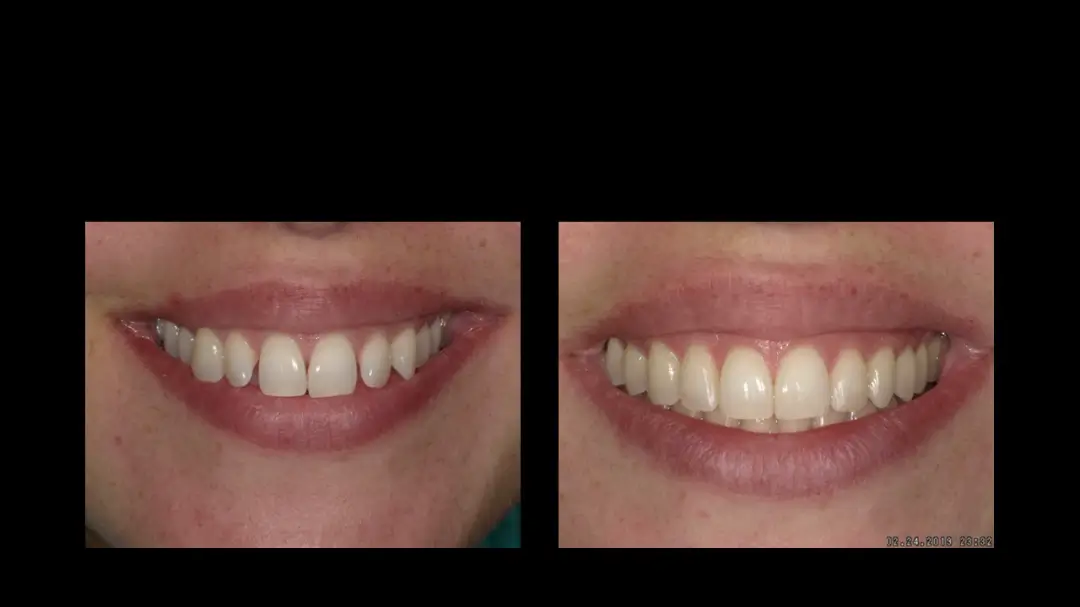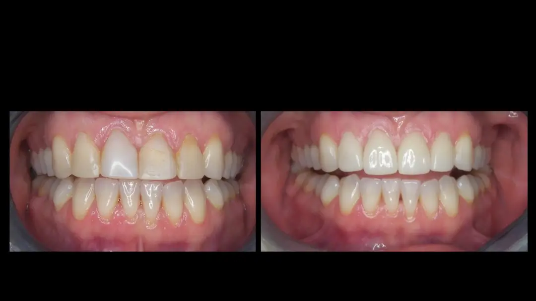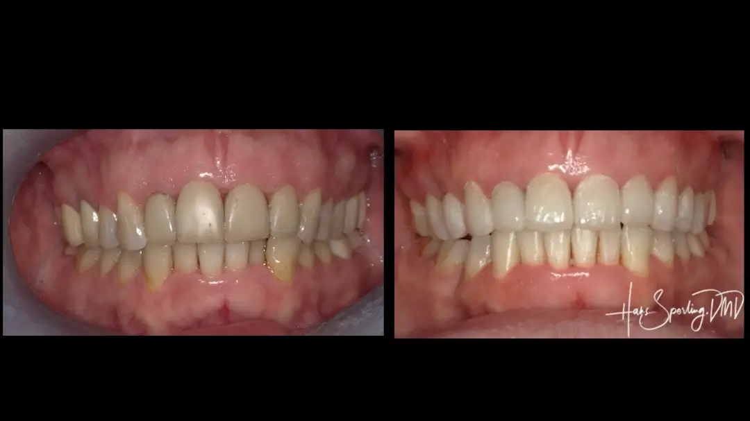 Before: Front (left) Central tooth has a poor restoration. Does not look natural and is not contoured properly to match the gumline of the rest of the teeth.