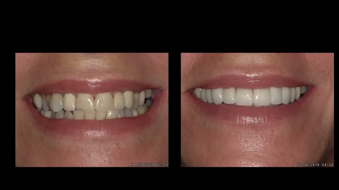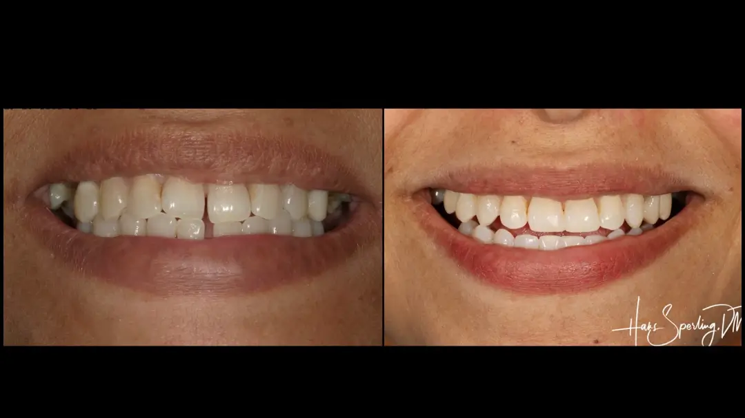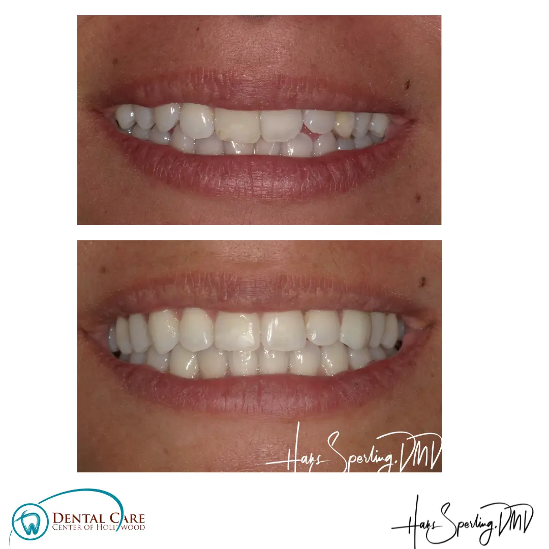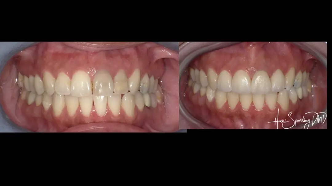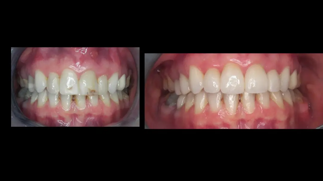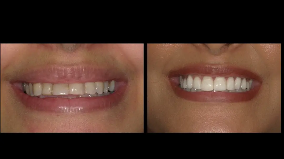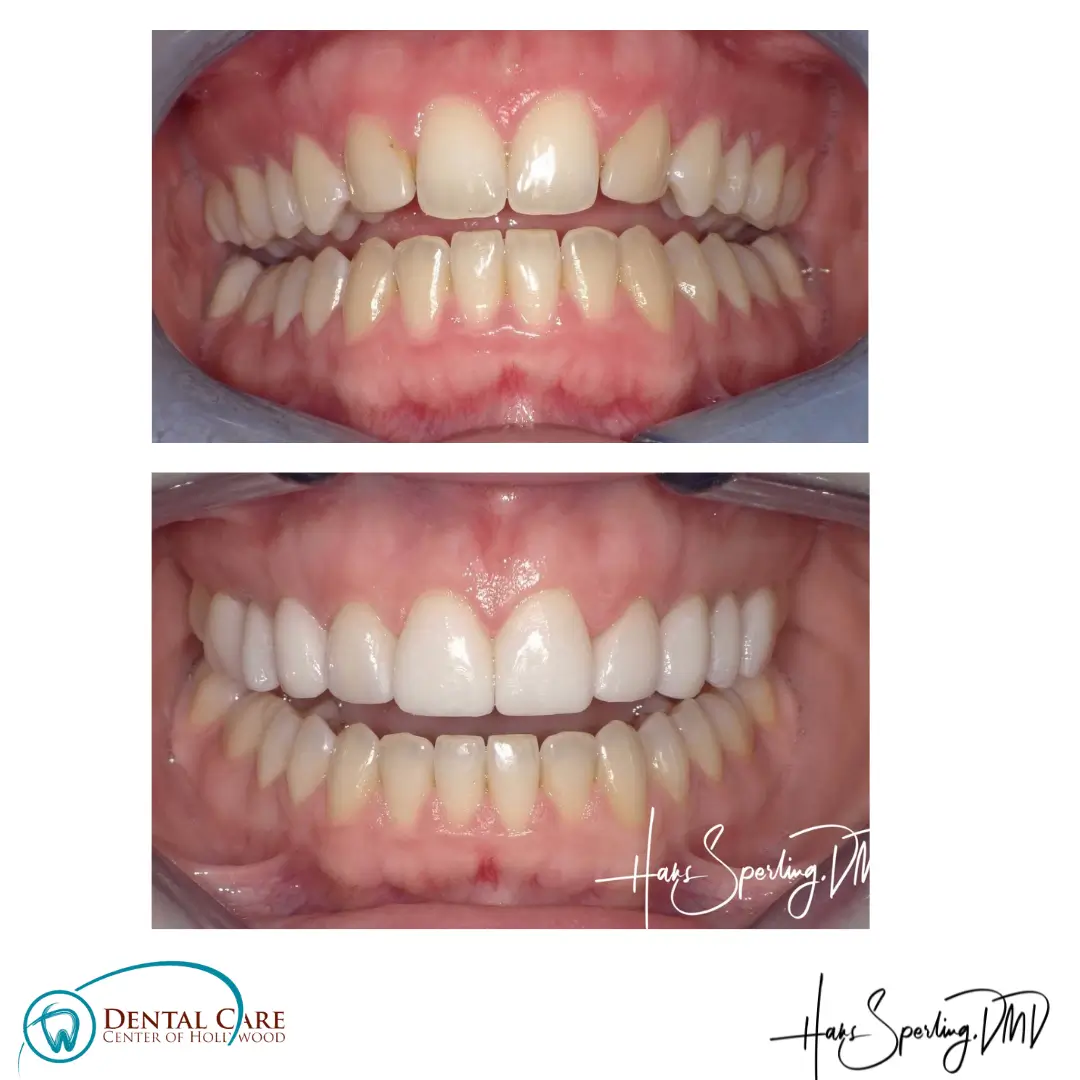 Before: Front (left) Central tooth has a poor restoration. Does not look natural and is not contoured properly to match the gumline of the rest of the teeth.