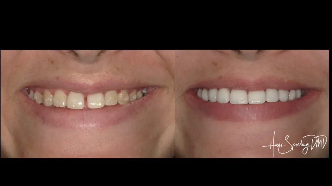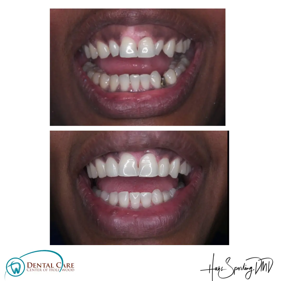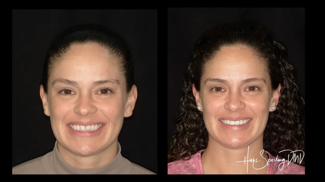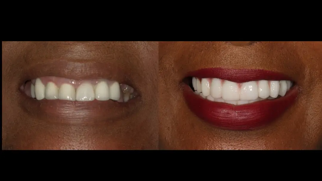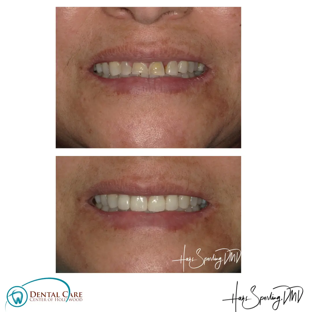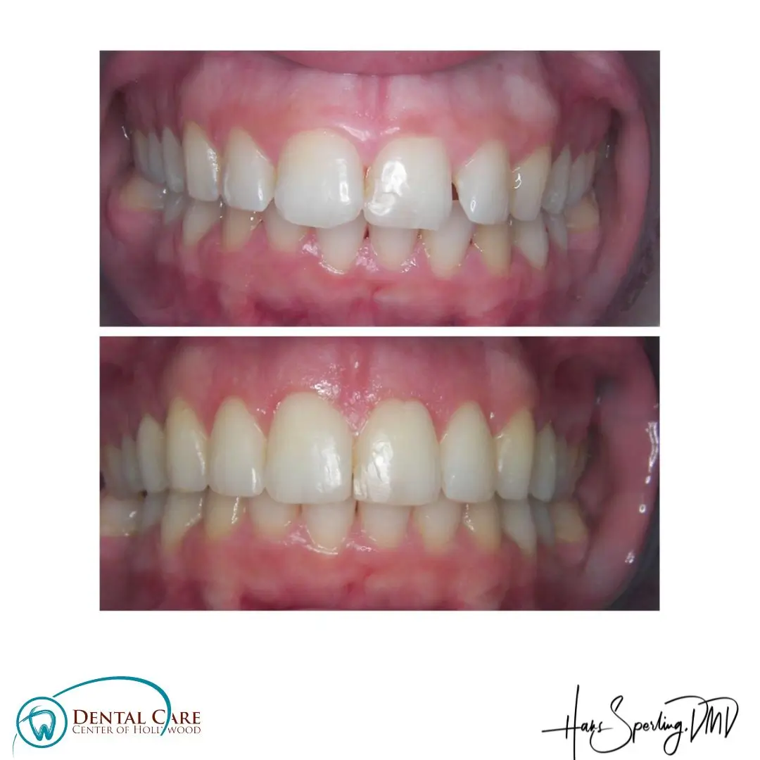 Before: Front (left) Central tooth has a poor restoration. Does not look natural and is not contoured properly to match the gumline of the rest of the teeth.