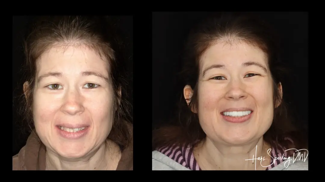 After: Smile and function restored with a Single Implant and an All Porcelain Crown (Cap) that fits securely over the implant.